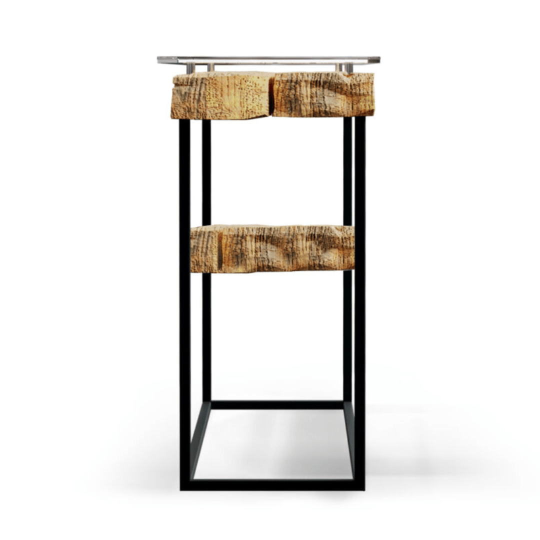 Nasz mebel został wykonany z metalowych nóżek połączonych ze sobą u podstawy prostokątną konstrukcją. Drewniane elementy konsoli wykonaliśmy z drewna pochodzenia wtórnego. Drewno zostało wyselekcjonowane tak, aby zapewnić naszym meblom trwałość i wytrzymałość. Całość zamyka szklany blat dodający całej konsoli nowoczesny wygląd i rustykalny styl.